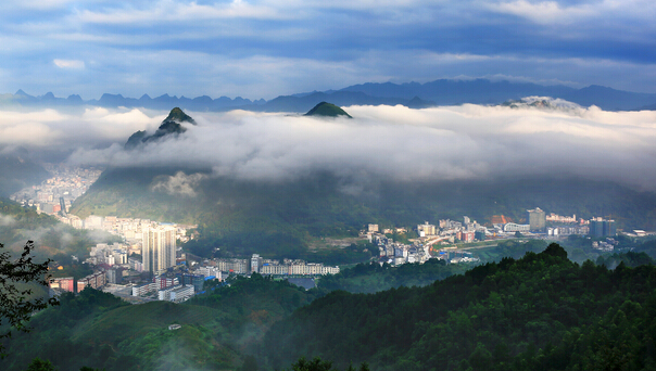 東蘭縣城地處“夾皮溝”里,該縣因勢建設,打造出一座“盆景式”的山城。圖為霧鎖東蘭山城景象。韋德生攝