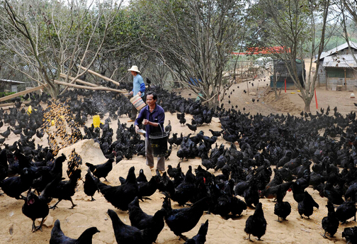 東蘭大力發展地方特色優勢產業,使板栗、烏雞、黑山豬等成為群眾增收的支柱產業。圖為全生態放養的東蘭烏雞。