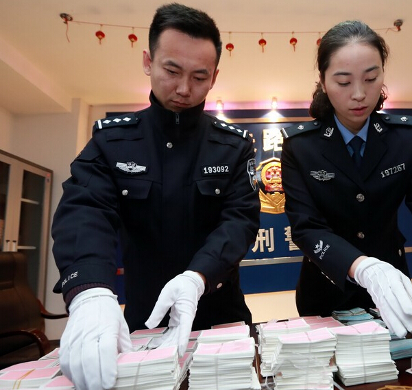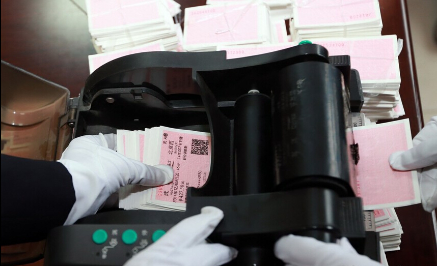 武漢鐵路民警清點收繳的假火車票樣品。