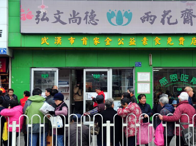 1月5日,一家公益性免費餐廳亮相武漢鬧市。坐落在武漢漢口循禮門江漢北路與解放大道交會路口的免費餐廳名叫雨花齋,由社會愛心人士集資籌辦,以提供素食為主。目的是通過免費供應餐食的形式,向公眾傳播“感恩”理念。