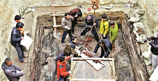 圖為:昨日,考古人員從棗陽郭家廟古墓中吊起發掘的瑟 記者王永勝攝