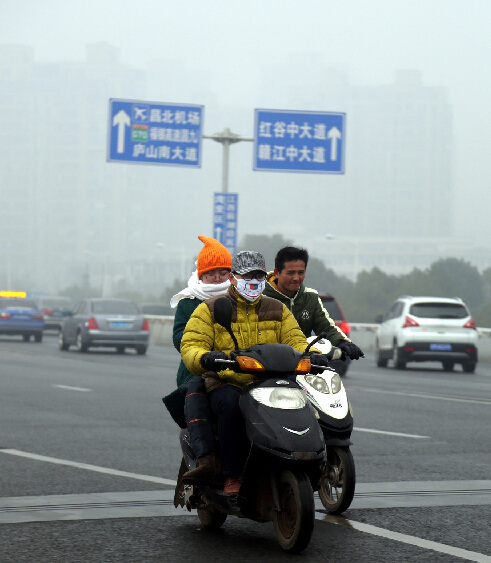 1月6日,江西省會南昌市環保部門的部分監測點pm2.5值達到179,屬中度污染。八一大橋及贛江對面的城市建筑在霧霾籠罩中若隱若現,街頭不少騎電動車的市民也是帽子口罩“全副武裝”出行。