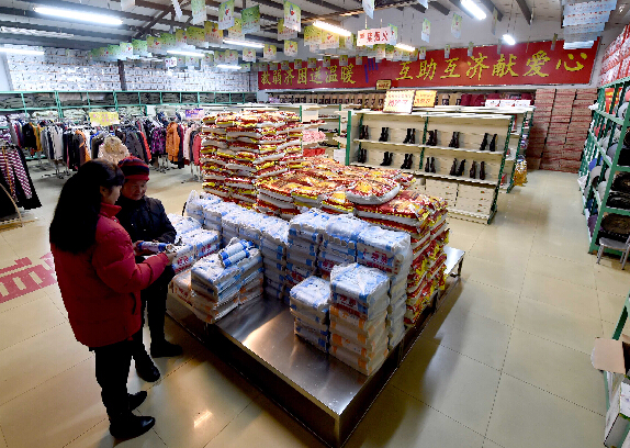 顧客在平頂山愛心救助超市內領取米、面。