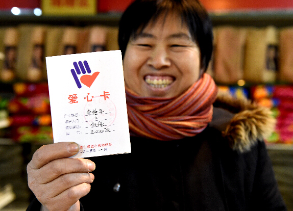 一位顧客在平頂山愛心救助超市內展示愛心卡。憑借這張卡,她可在超市內領取所需物品。