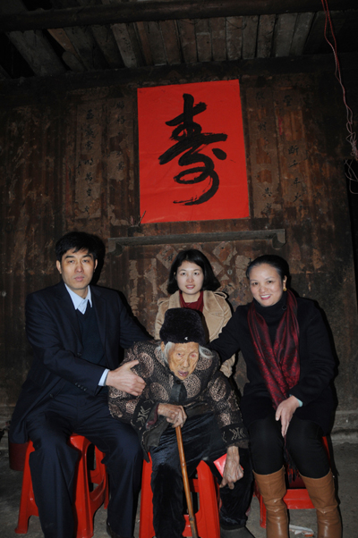 肖霞与父母同百岁老人在一起。杨坚 摄