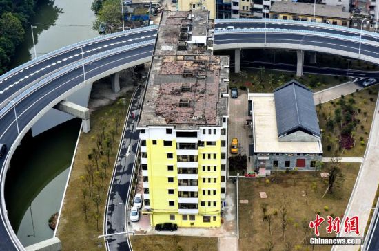 1月26日,位於廣州市永興街30號一居民樓四周被洪德立交圈包圍。近日,廣州洲頭咀隧道正式通車,一居民樓被洪德立交圈在其中,形成“圈中樓”。中新社發陳驥旻 攝
