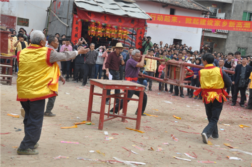 叩拜完畢之后,村中一位年過五旬、腰纏紅布的長者懷抱公雞,一口咬破公雞的脖子,另一長者早已用碗把雞血接住。腰纏紅布的長者拿出印章,蘸了雞血,不停地往神臺上堆滿的黃色神符上蓋。隨后,幾位長者在廟里把神仙請出,齊心協力用紅布將神仙固定于轎子之上。接著兩位五旬左右,身強力壯的長者抬著神仙不停地奔跑、舞動。大約每隔五分鐘,換上另一對長者繼續奔跑、舞動,就如舞獅舞龍一般,上下翻飛,煞為好看!