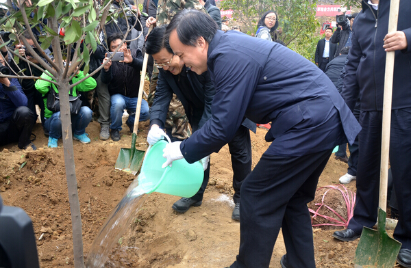 省委書記趙克志與省長陳敏爾共同為種下的樹苗澆水