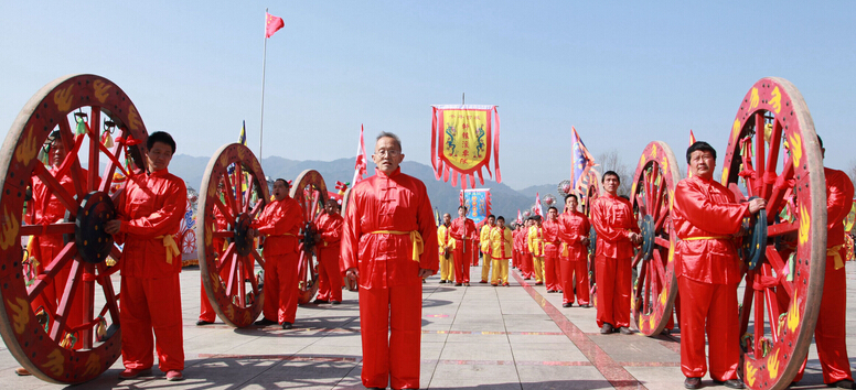 “軒轅車會”又稱車公會或車會。車會以涂滿鮮紅色彩的八輛大車輪為道具,以力與美為主要表現形式,配有江南民間舞蹈、器樂、儺面具及紋身涂彩裝飾,滾車表演熱鬧非凡、場面宏大;火輪車在馬路、街道、廣場上飛舞,旌旗、幡和輪形傘穿插其間。平滾車、發繞車、螺旋車等滾車技法精妙大氣,鑼鼓、鞭炮聲震天動地。