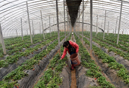 在山西平陆县后地村,一位村民在草莓大棚里劳作(3月19日摄)。位于中条山南麓的山西平陆县后地村,山大沟深,“靠天吃饭”一直是制约该村农业发展的“瓶颈”。近年来,在当地政府指导下,村里陆续建起了果蔬大棚,种植草莓、西瓜、西红柿等经济效益较高的蔬菜和水果。目前,该村从事大棚种植的村民有200多人,人均年增收2万多元。新华社记者 詹彦摄