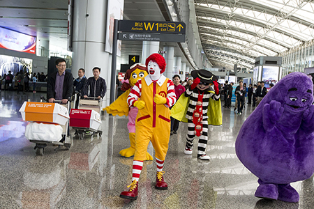 在中国,惊喜发生在广州新白云机场。3月24日下午一点到两点,乘坐南方航空公司航班的旅客,发现每一件行李都被精心系上了巨大的麦当劳行李牌,薯条、咖啡杯、冰淇淋……形态各异,充满乐趣。更令人意想不到的是,旅行归来的麦当劳叔叔、奶昔大哥、汉堡神偷和大鸟姐姐放弃明星通道,出现在行李运输带旁,和乘客一起等候行李,热闹玩耍。亲切贴心的接待员姐姐在现场派送气球和McCafé的免费咖啡,替乘客驱散旅途疲惫。乘客们凭这些行李牌还可以在广州任何一家麦当劳餐厅兑换相应美食。
