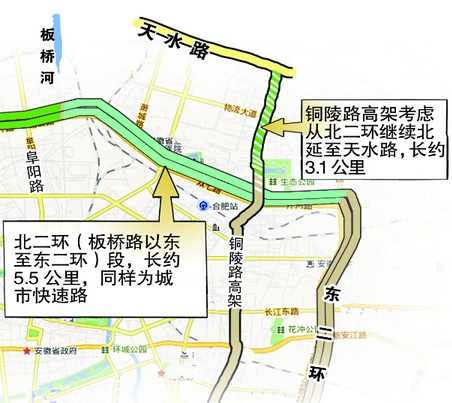 其中擬對上海路裕溪路至錦繡大道段進行工程設計,該路段長約7.2公裏,為城市主幹道;北二環(樊窪路—板橋河以西)段,含寬板橋河橋,長約11公裏,設計為城市快速路;北二環(板橋路以東—東二環)段,長約5.5公裏,同樣為城市快速路。銅陵路高架則考慮從北二環繼續北延至天水路,長約3.1公裏;金寨路6.9公裏的206國道段,則將連接312國道—方興大道,道路等級為城市快速路。