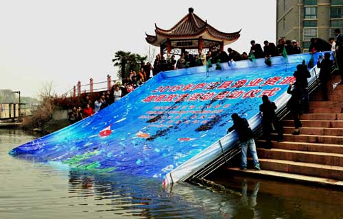 [香港商報網訊]通訊員周躍東 章禮軍報道:3月27日,2015年廬江縣漁業資源增殖放流活動在白山鎮白石天河畔正式啟動,55萬尾鰱魚、鱅魚、鯽魚、鯿魚、河蟹等魚苗相繼“遊”進巢湖流域的白石天河,這是該縣連四年在大型天然水域實施人工增殖放流魚苗550多萬尾,並對巢湖流域部分天然水域實施了禁漁期制度,使水域生態、水生生物資源得到修複和保護。