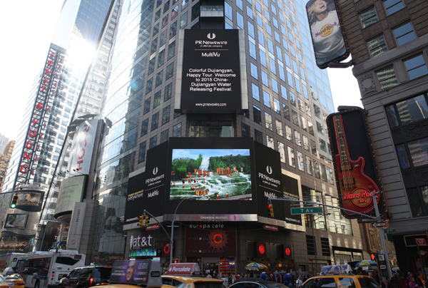 2015都江堰放水节在纽约时代广场直播情景
