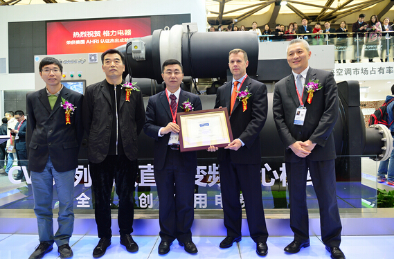 AHRI(美國制冷空調與供暖協會)總裁Stephen Yurek(右二)為格力電器授予“美國AHRI認證杰出成就獎”,格力電器常務副總裁黃輝(左三)代表領獎。