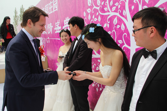 經過了“牽手同行”、“海枯石爛”、“海誓山盟”等見證儀式后,法國圖爾副市長杰羅姆·泰巴迪先生為10對愛人的愛情宣言進行了見證。他表示,這是他第一次在中國參加這樣有意義的活動,法國是薰衣草的主產地,能在洛陽的薰衣草莊園為這些相親相愛的人做見證,他感到萬分榮幸。同時,他也希望下次能夠帶著自己的愛人來中國參加這樣的活動。宣讀愛情誓言后,杰羅姆先生為新人們送來了從法國帶來的愛情禮物。