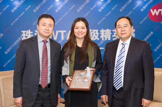 李娜接受珠海WTA超級精英賽全球形象大使頭銜,與珠海華發體育運營管理有限公司執行董事陳玨(右一)、珠海華發體育運營管理有限公司總經理呂品德(左一)及場館模型合影.