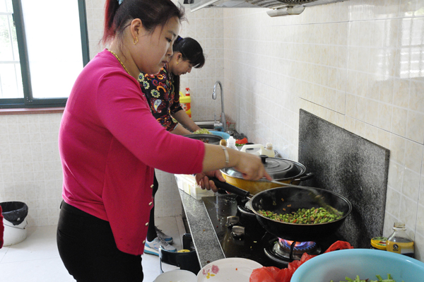 湖畔人家女主人程桂花燒制農家土菜接待遊客 。