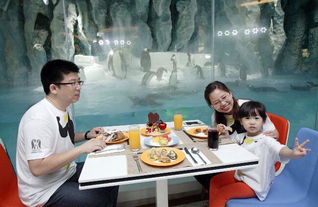 一張餐桌置于極地冰甲之上,美味佳肴冒著熱氣并散發著誘人的味道,一家人圍坐在餐桌旁,一群可愛的企鵝與你相隔咫尺,它們或紳士模樣的站在用餐者的身旁,或暢游在不遠處冰雪融匯而成的海里,就在這時,為孩子留下與這些南極精靈的合影,幸福洋溢在臉上也充滿內心。如此溫馨美妙的場景,如今,在位于珠海橫琴長隆國際海洋度假區的長隆企鵝酒店已經成為現實,而且,全球獨此一家。