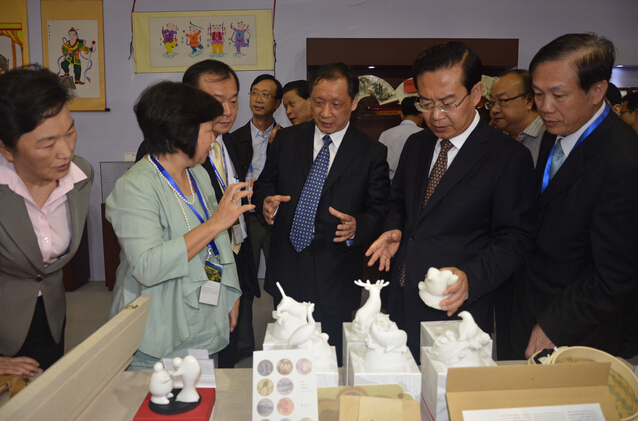 海峽兩岸旅游文創產品大賽評獎結果在第十一屆旅博會主展區揭曉。來自福建的“《雅集》系列產品”、北京的“冰箱貼旅游一卡通”、山東的“多彩青島系列絲巾”、新疆的“千年錦繡旅游紀念品”、臺灣的“小籠包調味罐組”獲得金獎。圖為:國家旅游局局長李金早、福建省省長蘇樹林、福建省旅游局局長朱華等領導參觀海峽兩岸旅游文創產品