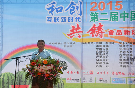 2015年5月30日,由湯陰縣委、縣政府與新農商·恒大農業牽頭聯和眾多企業和商家,在湯陰縣恒大農業基地舉辦“和創互聯新時代、共鑄食品新防線”2015第二屆中國安陽新農商·恒大西瓜節,中共湯陰縣委副書記賈曉軍、新農商發起人董事局主席張曉民、新農商CEO邵也等出席開幕式。