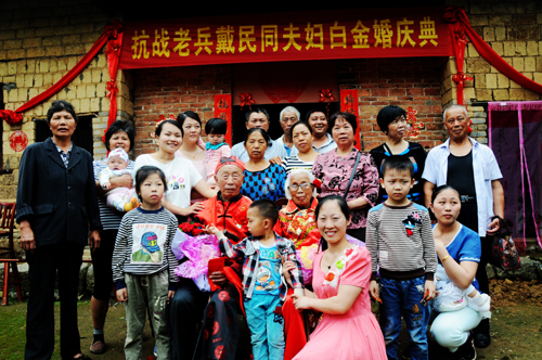 【香港商報訊】記者劉洗湧、特約記者楊堅、歐陽麗玲報道:6月12日,是湖南省邵陽市新寧縣高橋鎮岩底村塘子沖組抗戰老兵戴民同與老伴許二娘結婚70餘年的紀念日,中共新寧縣委統戰部、縣民政局等單位為他們舉辦了白金婚慶典儀式。