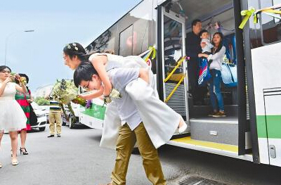 6月13日,綿陽一對“80后”新人別出心裁,租用一輛電動公交車結婚,環保節儉又浪漫。圖為新郎從電動公交車上背下新娘。