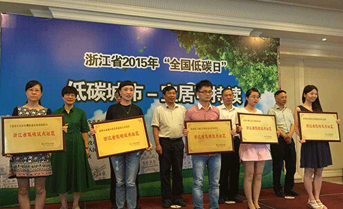 杭州市下城區東新街道東新園社區、杭州市余杭區良渚街道良渚文化村、杭州市桐廬縣江南鎮環溪村等浙江省第一批低碳社區試點創建單位獲授榮譽牌,杭州良渚文化村社區、溫州郭公山社區和湖州白魚潭社區代表分享各自的經驗和做法。