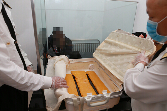 通報稱,4月20日上午10:13左右,一名身穿格子襯衫和黑色外套的黑人青年男子背著一個黑色斜挎包,拖著一個白色塑料行李箱走進海關監管區,當班關員示意其將行李物品過機檢查。細心的關員在層層疊疊的機檢圖像中發現異常圖像,于是要求該男子打開行李箱接受進一步檢查,但是箱內只有零散衣物和一些日常用品,幾件全新的女性衣物標簽均未拆下,與機檢成像情況差異較大,關員心中的懷疑進一步加深。經關員查閱護照顯示,該旅客來自非洲貝寧共和國,4月9日自廣州白云機場入境。關員憑借豐富查緝經驗,認為該旅客存在利用行李夾藏違禁品的重大嫌疑,于是啟動重大案件處置程序,一方面,及時控制試圖多次脫逃的嫌疑人,另一方面,利用工具對行李箱體進行技術檢查,最終發現行李箱內的特制夾層,并從夾層中查獲三條用黃色封箱膠紙包裝的白色晶狀物,經現場快速檢驗為冰毒,案件迅速移交至緝私部門。