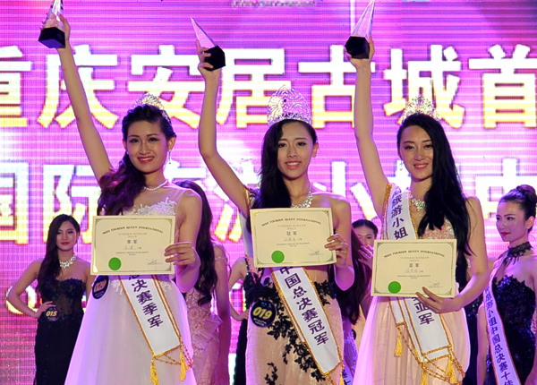 【香港商報網訊】記者 黃慶松 通訊員 葉健 報道:6月21日晚,2015重慶安居古城首屆旅游節暨國際旅游小姐中國總決賽頒獎盛典在重慶安居古城舉行,在銅梁中國龍熱情奔放的表演中,來自全國各地的50余名參賽佳麗,經過活力裝、泳裝、晚裝等環節的角逐,來自山東的選手孫嘉希獲得冠軍、浙江選手徐夢瑤獲得亞軍、江蘇選手朱健獲得季軍、新疆選手蘇比努爾獲得第四、重慶選手戴妮娜獲得第五名。