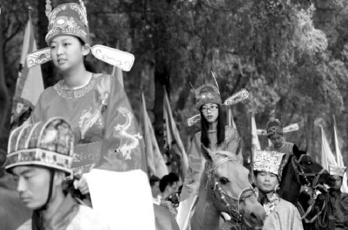 本月9日襄陽市古隆中景區,“2015古隆中狀元季學生旅游節暨三國國際動漫旅游節”開幕式舉行,近千名游客參與現場體驗。在這個由襄陽市教育局、旅游局與湖北鄂西生態文化旅游圈投資公司聯合主辦的活動上,湖北省文、理科高考“狀元”、“榜眼”,身披大紅“狀元服”,騎馬巡街,吸引了不少游客的目光。