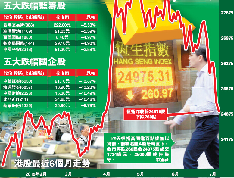 【香港商报网讯】记者伍敏报道:虽然希债危机下全球投资气氛转差,惟港股成全球重灾区,跌幅远超欧美国家,昨天恒指高开逾百点后无以为继,继续追随A股急转直下,收市再跌260点收24975点成交1724亿元,25000关终告失守,腾讯(700)及港交所(388)未止跌,截至截稿时,夜期更跌逾700点。内地救市将中证500指数期货客户日内单方向开仓交易量限制为1200手,惟结果仍告失效,中证及深证齐齐恢復跌势。