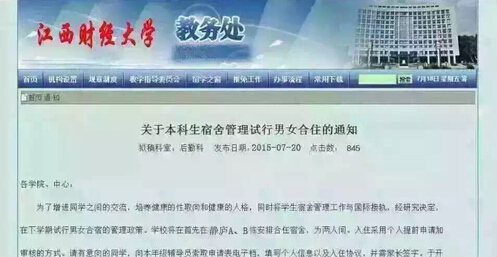 近日,網上廣泛流傳著一張疑似江西財經大學教務處“試行男女合住通知”的照片,同時還公布了申請流程,需要填寫入住協議并交由家長簽字等。