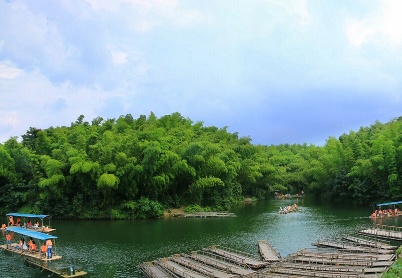 海中海湖水碧綠,深不可測,四周被竹山環擁,湖底盡收楠竹嫵媚的身影。泛舟其上,彷佛沉醉在一個綠色的夢中。這裏的竹筏是100%自助,