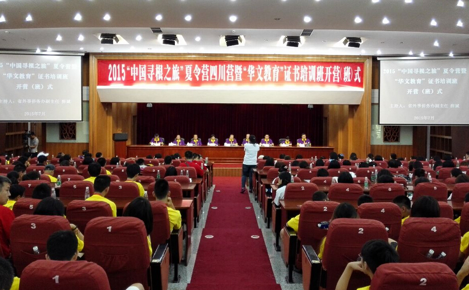 【香港商報網訊】記者金山報道:23日上午,由國務院僑辦主辦的2015年海外華裔青少年“中國尋根之旅”夏令營四川營和“華文教育”證書培訓班開營(班)儀式在四川行政學院舉行,來自全球20多個國家和地區的300位青年朋友和海外華文教育工作者歡聚一堂,四川省人大常委會副主任彭渝、國僑辦文化司副司長湯翠英等領導參加開營儀式並致辭。