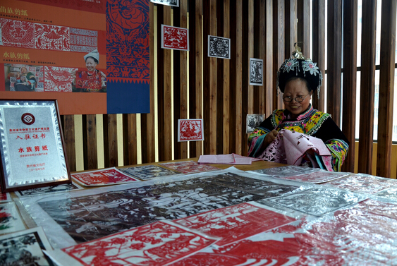 一名匠人在展示國家級非物質文化遺產“水族剪紙”的制作過程