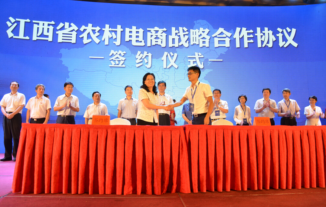 峰會舉行了江西省農村電商戰略合作協議簽約儀式。省商務廳副廳長李青華、阿裏巴巴集團農村淘寶事業部南大區總經理樊偉俊分別代表雙方簽約。隨後還舉行了 “互聯網+革命老區農村電商”新長征起點授旗儀式。