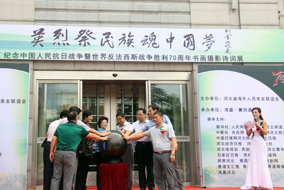【香港商報网訊】記者梁君怡報道:日前,為紀念中國人民抗日戰爭暨世界反法西斯戰爭勝利70周年,以“英烈祭民族魂中國夢”為主題的大型書法、繪畫、詩詞、攝影展在河北省美術館開幕。此次活動由河北省海外人員親友聯誼會主辦,海盛集團承辦。