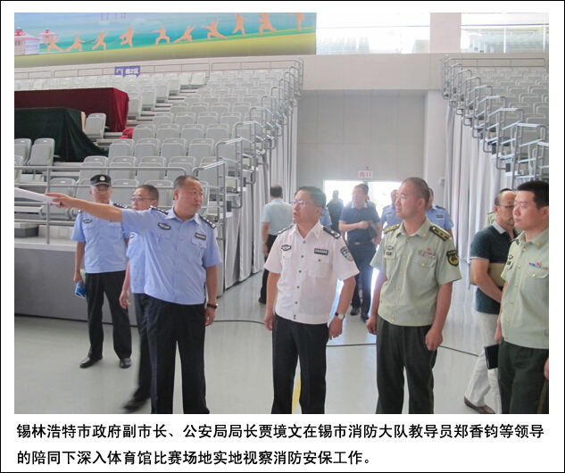 【香港商報網訊】記者王思娜 孫榮報道:為做好“第八屆亞洲青少年武術錦標賽”期間消防安保工作, 8月5日,錫林浩特市政府副市長、公安局局長賈境文在錫市消防大隊教導員鄭香鈞等領導的陪同下,深入體育館比賽場地實地視察消防安保工作。