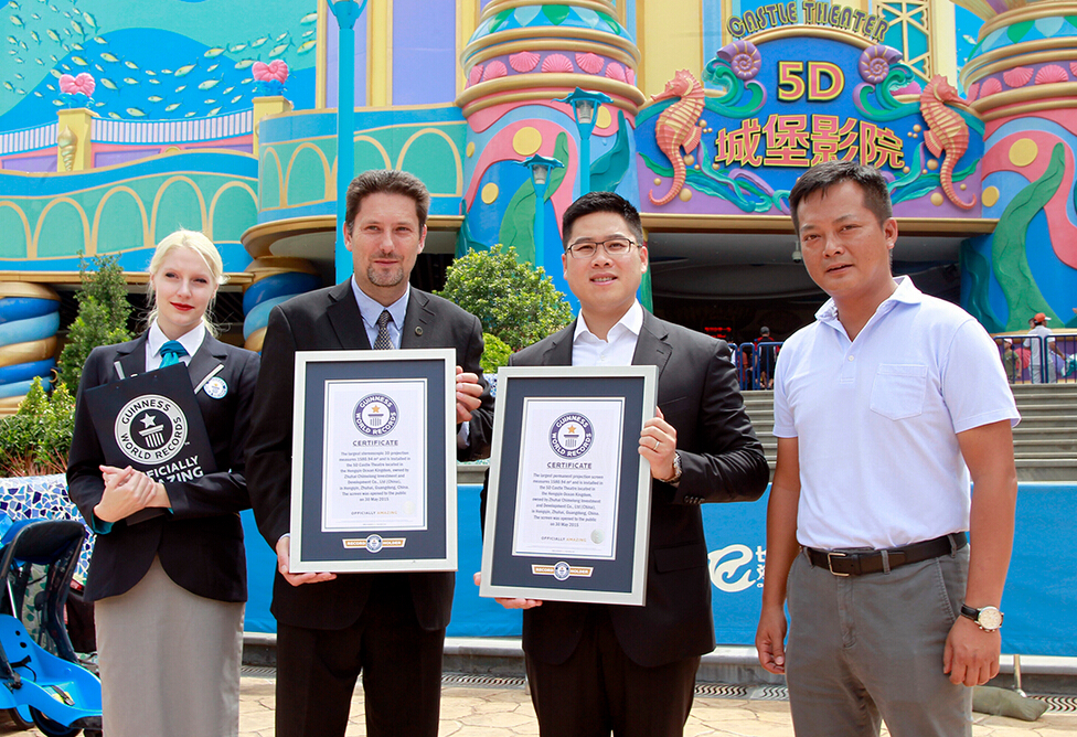 8月19日上午,在珠海橫琴長隆海洋王國5D城堡影院內,在數十家媒體和1000多名游客見證下,吉尼斯世界紀錄有限公司大中華區總裁Rowan Simons向長隆集團副總裁蘇展鵬頒發長隆海洋王國5D城堡影院3D弧形屏幕成為“最大的永久性投影屏”、“最大的3D立體投影”兩項吉尼斯世界紀錄證書。