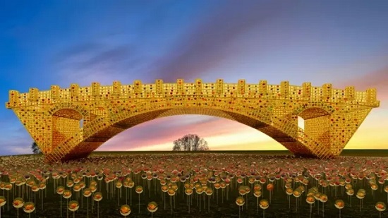 湖南省攝影家協會藝術顧問、著名當代藝術家舒勇,以2015米蘭世博會為創作平臺,以國家戰略“一帶一路”為創作語境的《絲路金橋》,以絲綢之路沿線的各個國家的國花和市花為元素,以“天下第一橋”趙州橋為創作原型,筑成了這座弘揚和諧的和平、發展之橋。