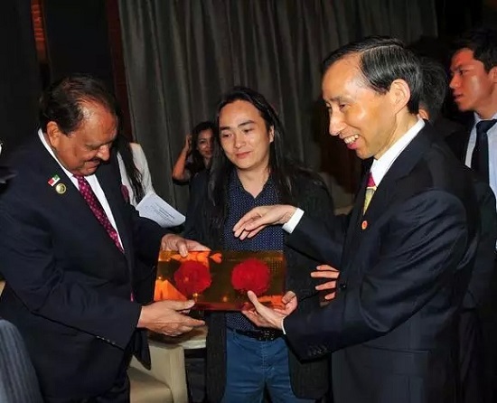 招待會上,司馬義、沙祖康與中國國際文化傳播中心執行主席龍宇翔共同邀請侯賽因總統在內塑巴基斯坦國花素馨的“絲路金磚”上簽名。總統非常愉快地在絲路金磚上簽字,這是對中國實施一帶一路戰略的贊賞與認同。巴基斯坦是首個和中國建立外交關系的伊斯蘭國家,作為中國的堅定朋友,“是長期、全天候和多方面發展的友好關系”,網民稱其為“巴鐵”。巴基斯坦更是一帶一路重要的伙伴,當前,中巴經濟走廊建設取得重要進展。這塊由總統簽名的絲路金磚將裝載在“絲路金橋”作品中,成為中巴鐵哥們的象征。同時,由龍宇翔與絲路金橋創作者、中國著名當代藝術家舒勇共同贈送一塊內塑中國牡丹的“絲路金磚”予侯賽因總統,這塊絲路金磚也將伴隨侯賽因總統一路西行,成為見證中巴友誼的珍貴藝術品。