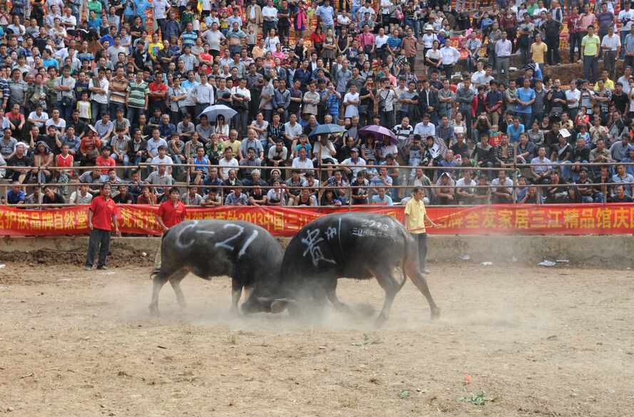 據主辦方負責人楊兵仁介紹,廣西三江縣聚居著一個古老而又神秘的民族——侗族,他們信仰多神,崇拜自然物,鬥牛是最喜愛的娛樂活動之一。侗族鬥牛已有數百年曆史,鬥牛文化代表了侗族人們勤勞勇敢、不服輸的精神及熱情好客的民族美德。“鬥牛是一種動態文化,是大眾娛樂活動,文化特征明顯,體驗性強,場面過程震撼人心。三江縣侗族聚居地多次舉辦鬥牛節,村民用雄性水牛相互廝鬥,既是娛樂活動,也寓意來年物產豐收。”此次鬥牛節參賽的鬥牛品種主要為水牛。相比於前兩屆,今年參賽名牛數量多達140頭,分成4組參賽。屆時,一百多頭鬥牛將通過激烈的比拼爭奪“牛王”稱號和大獎。上萬遊客將會看到體型剽悍的鬥牛勇猛地沖向對方,強勁的犄角狠狠地撞在一起的激烈爭鬥場面。