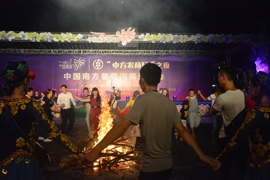 8日晚上舉辦的中國南方葡萄溝露天酒會和篝火晚會上,專業品酒師在舞臺上推薦說,“野紅葡萄酒口感醇厚,有一股水果的清香,和我們的中餐搭配一點都不違和,非常美味……”隨著品酒師的專業推薦,一款款“野紅”葡萄酒在酒會上競相拍賣。