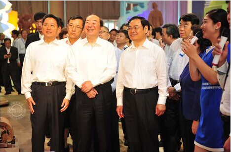 中宣部常務副部長黃坤明(左二)、山西省委書記王儒林(左三)、山西省長李小鵬(左一)等在文博會主展館中國(太原)煤炭交易中心展覽中心進行巡館