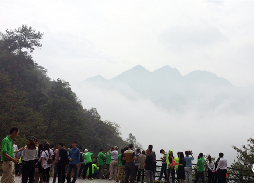井岡山除了擁有紅色基因外,這裏的青山綠水也是生態江西的代表。雨後的山中雲霧繚繞,讓人猶如置身仙境。作為舊版百元人民幣的背面圖案,巍巍五指峰在采風團一行的期盼中,逐漸從雲霧裏露出真容,吸引大家競相拍照。而坐落於龍潭的仙女瀑,溪水飛下斷崖,猶如微側身的仙女飛天像。