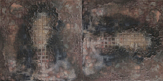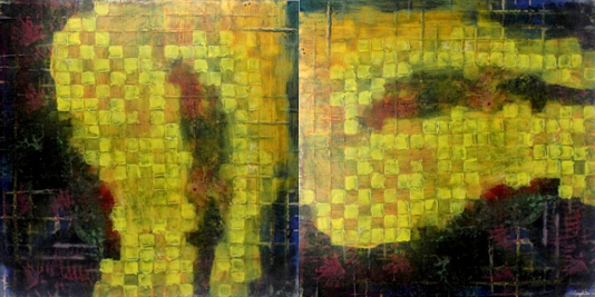 作品解讀:夢系列的代表作之一,這幅作品以夢幻的色彩把人們帶入夢鏡,在運用自己繪畫語言的同時,又運用了拓印的技法,使夢幻的景色更加虛幻,再結合夢幻人物的構圖和材料加入後的效果猶如穿越時空,達到既有呼之欲來又有呼之欲出的效果,把人們帶入作品中進入自己的夢鄉