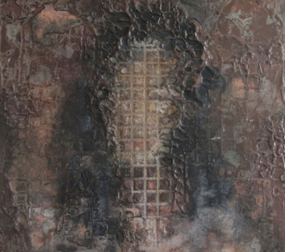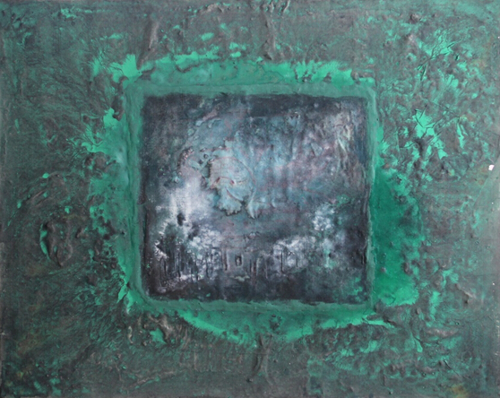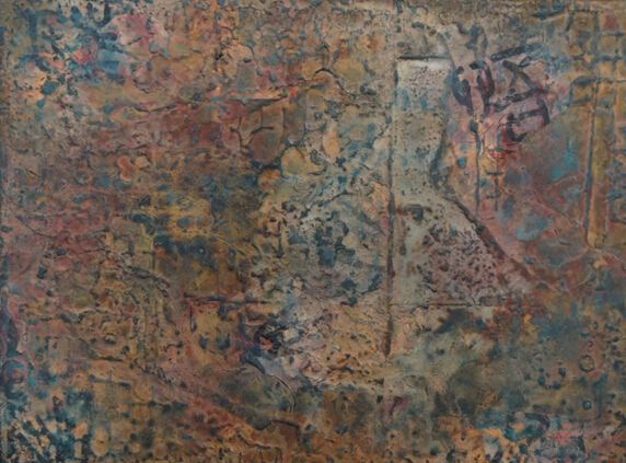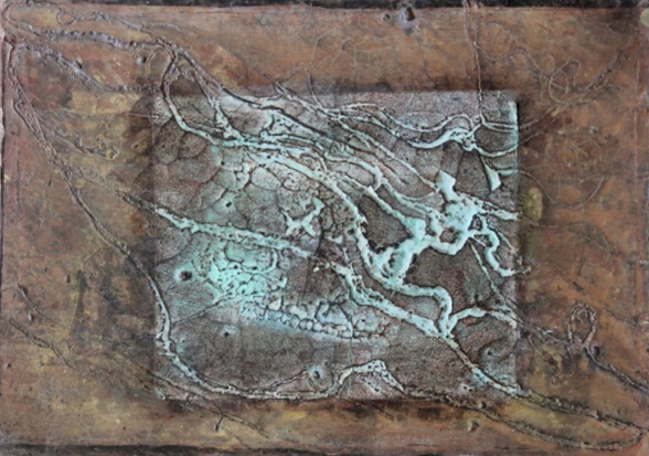作品中生動的紋理處理讓人聯想到遠古的自然美麗的景觀,有遠古的象形文字和化石,又有中國傳說中的龍的影子,加上自己繪畫語言的巧妙運用猶如穿越時空回歸自然,在講述著古今的變遷,再加上拓印的技法使作品更有層次,更有對比效果,彰顯大自然的魅力,這幅作品可以多角度的欣賞,讓人們回味無窮。