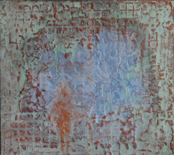 作品的解讀:這是一幅融合了中西文化的作品,潘多拉瓶子再現了西方神話傳說的故事,一半瓶子的破碎,一半瓶子在神貼的震懾妖魔保護下完好,在破碎的一面可以看到各種精靈、鬼怪、乘虛而出,使這個世界充滿了恐怖、災難......;同時又融入了中國文化元素,四個角運用了拓印將中國文字和象形文字融入作品中,右上角的佛字及西藏的天梯的運用,把人們帶入神秘的遠古時代,色彩處理上又宛如莫高窟的壁畫。