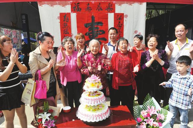 10月18日,成都青白江(微博)的陳元和從早上7點過就忙個不停,又是聯系舞蹈隊,又是招呼客人,還要催促廚師。這一天,是她母親林素萍老人滿100歲的生日。除了一家五代45口人悉數到場,還有親戚朋友也來為老人祝壽。問及長壽秘訣,老人很大方地說:“女兒女婿還有孫兒些這么孝順,我怎么舍得走太早?”老人將自己的長壽歸功于后輩的陪伴。